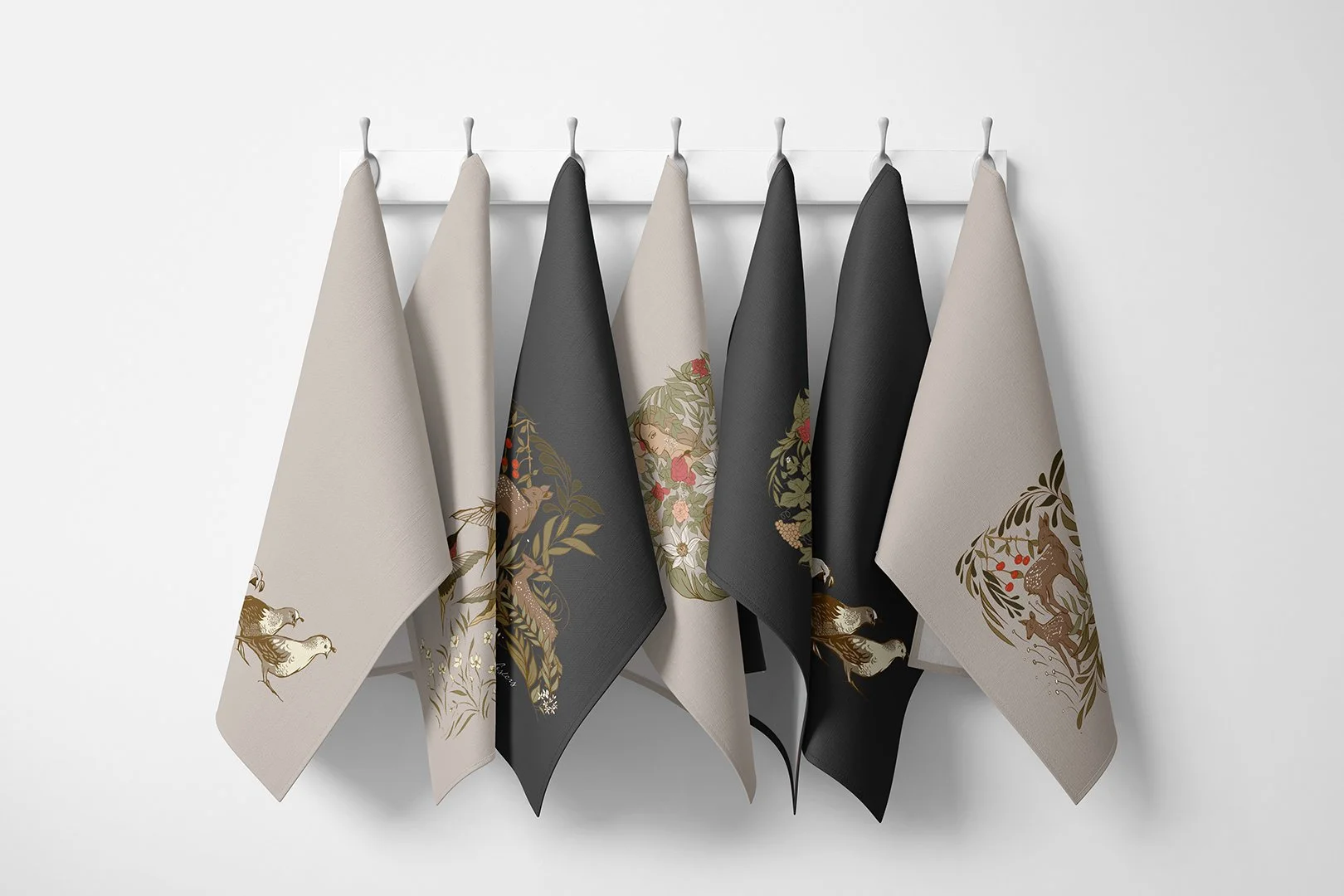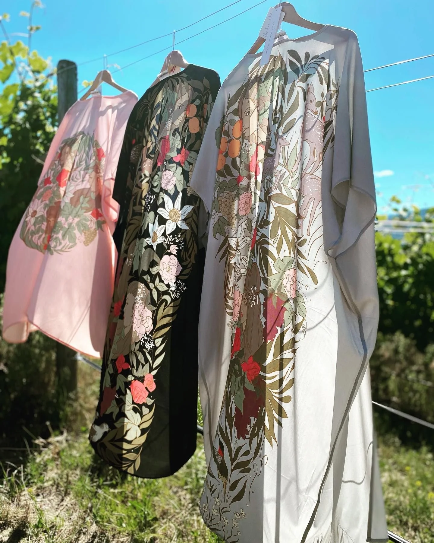 The paintings are rich in symbolism, featuring elements native to the region—quails, hummingbirds, cherries, peaches, grapes, roses, and even the gentle deer that roam the vineyards. These elements not only adorn the walls of the tasting room but have also been transformed into a beloved line of merchandise, including custom tea towels, tote bags, kimonos, and scarves.